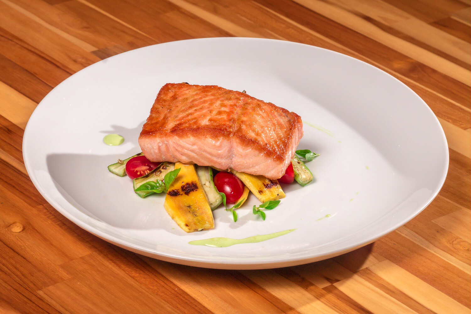 Salmão, Legumes e Molho da casa - Serve 1 pessoa